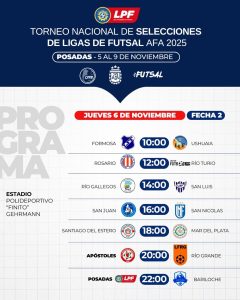 El torneo Nacional de Selecciones de Ligas de futsal AFA continuará hoy con la 2° fecha, en tanto que este viernes se disputará la 3° y última jornada de la fase de grupos. Los primeros de cada zona clasificarán a las semifinales, que se jugarán el sábado, mientras que la gran final será el domingo al mediodía.
